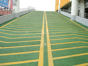 3,耐磨防滑骨料同时撒布,使撒布的防滑颗粒60%在涂料里,待12小时基本固化后在进行下道工序,喷撒的防滑颗粒均匀,这样既美观又实用